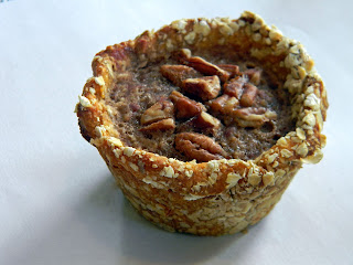 This pie is your standard spicy custard-style concoction, akin to a pumpkin pie. However, in place of pureed squash, I used an adapted version of a recipe I found in Crescent Dragonwagon's Bean by Bean Cookbook which used - you guessed it - pureed beans. Unlike the cookbook's version, which uses pinto beans, I cooked up some adzukis I already had on hand. We had lots of potatoes nearing "sprouting" stage, including a sweet potato beginning to soften, so I whipped up a few batches of my lower-fat Potato Pastry Crust. I used a "white potato" version for my larger "main" pie, but since I found myself with some extra filling left over I rolled out the sweet potato dough in a bed of rolled oats (instead of flour) and made some tartlets. Knowing that the tartlets would be kept aside for my pecan pie-loving Mom, I garnished those with a sprinkle of chopped toasted pecans for a bit of flair. Nobody I served it to knew what went into it before they had a bite, and after they found out, they still polished off their slices and asked for the recipe! To me, the satisfaction of a job well done, done for the sake of making someone else's life a little better, is the greatest comfort there is.